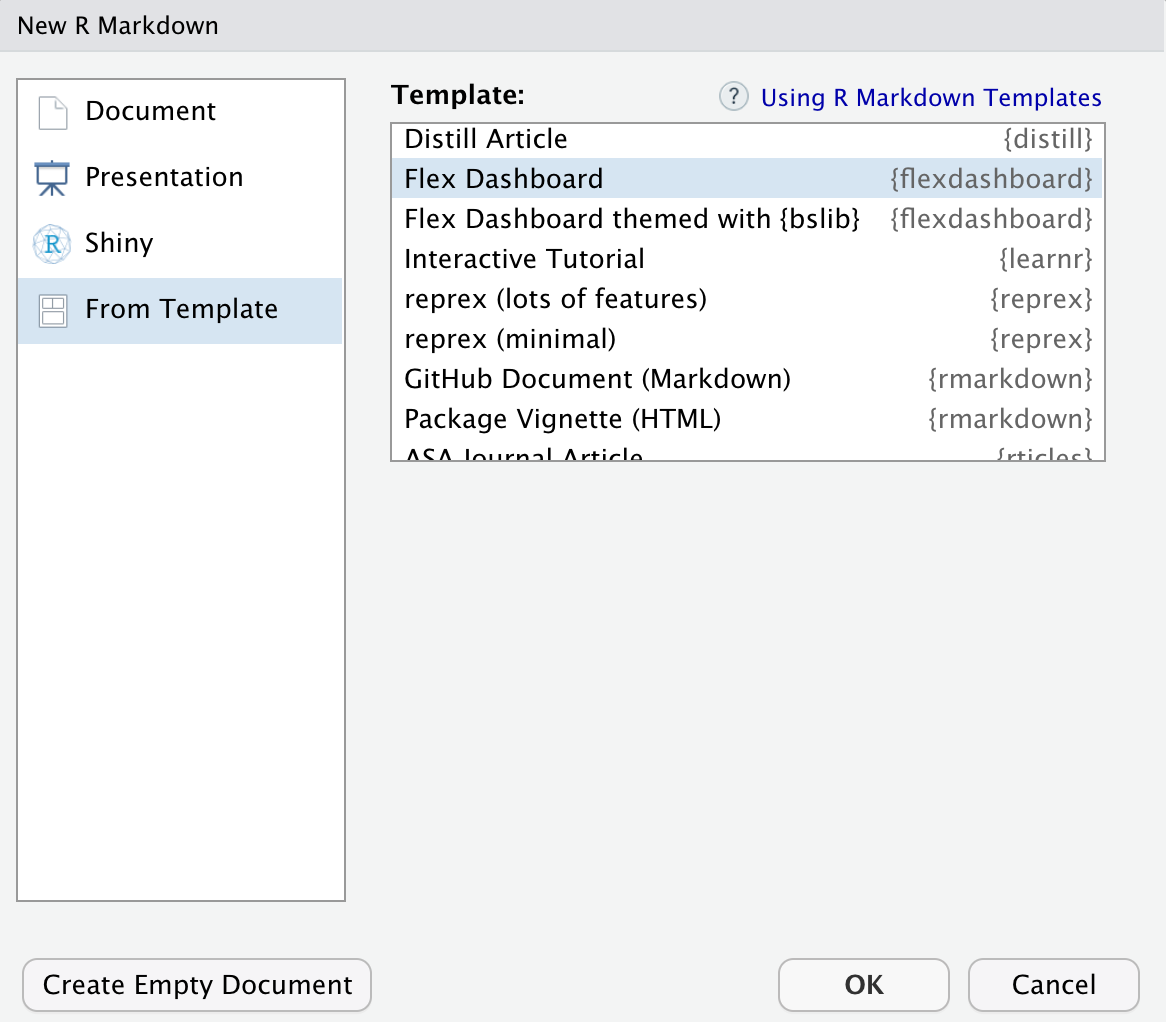 If you are not using RStudio, you can create a new flexdashboard R Markdown file from the R console. Currently there are two templates: